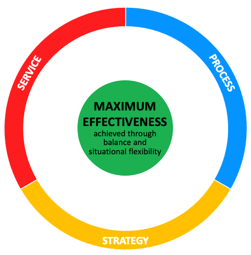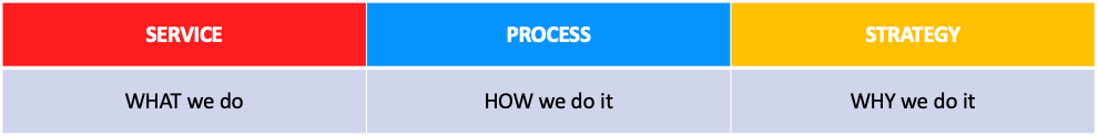 If the company you work for sees your team as only filling one of these qualities, it will be easy to eliminate or reduce your team if, one day, that quality becomes no longer needed or valued. You should strive to be seen as valuable for your service, process and strategy, so if one of those becomes less valuable you still have the other two qualities to offer.